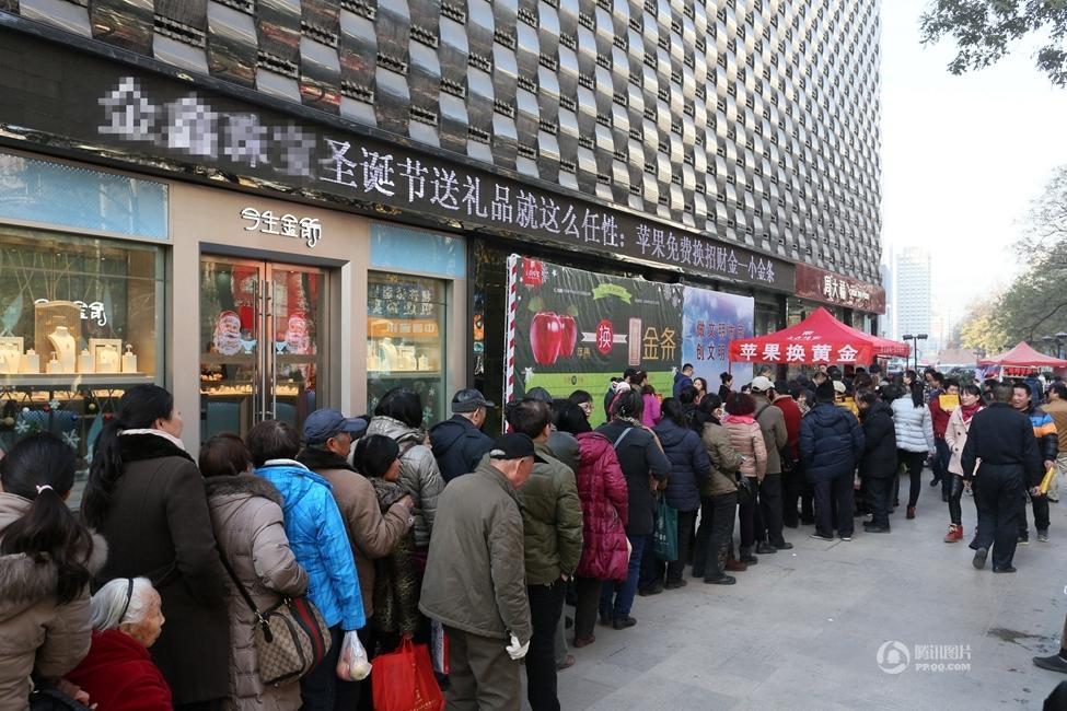 2014年12月23日,郑州二七路一珠宝广场,200多位市民排起了数十米长队,拿着苹果等待换黄金。据介绍,为了迎圣诞节,凡持一对苹果到金鑫珠宝正弘店,即可免费兑换迷你“招财金”小金条一个。