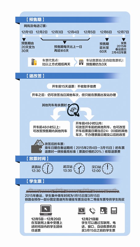 近期,铁路客票系统经历了史上最大幅度的改革,预售期、退改签规则变化巨大,各项措施都将在12月7日之前落地。这也预示着,2015年的春运,想坐火车的人将面临一个全新的、甚至是陌生的购票环境。如何在春运紧俏的火车票中“大海捞针”,抢购到自己想要的火车票?本报为您推出2015年春运购票攻略。