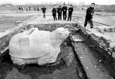 因洪水肆虐而被深埋水下330多年的“东方庞贝”泗州城,经过三年多的考古发掘,已确定了古泗州城遗址范围。图为2014年12月在江苏省盱眙县淮河镇城根村泗州城遗址拍摄的碑座。