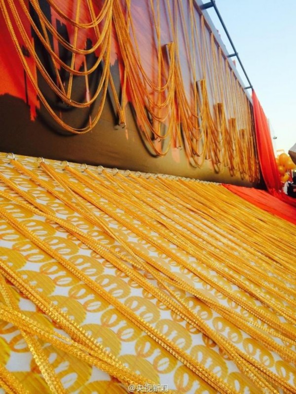 这条金链是由70多名工人,连续工作40天,每天工作十多个小时,打造而成。工人们先打造出许多金链,然后再把这些链连结成5000米长的金链子。